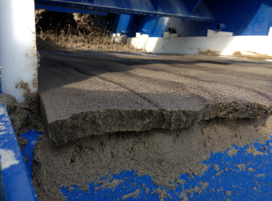 脫水震動篩是使用一種反斜坡之脫水板,間隙開口為 0.3 至 1.0mm,有兩台震動馬達產生之線性震動,使砂床(砂餅)直接向上坡爬至斜槽(P),過濾之水被回收到儲料槽(B),清潔和脫水之砂其濕度為 25%~30%(可調整)。